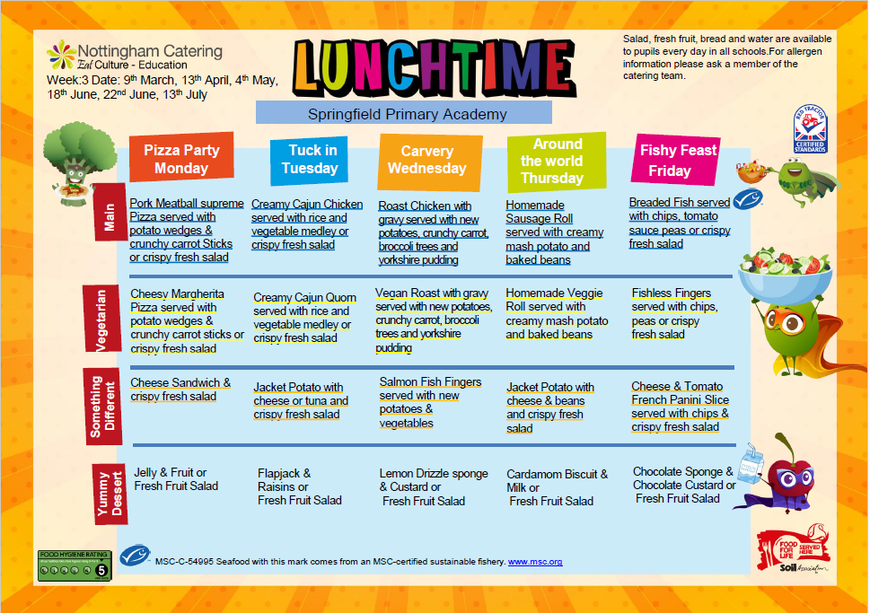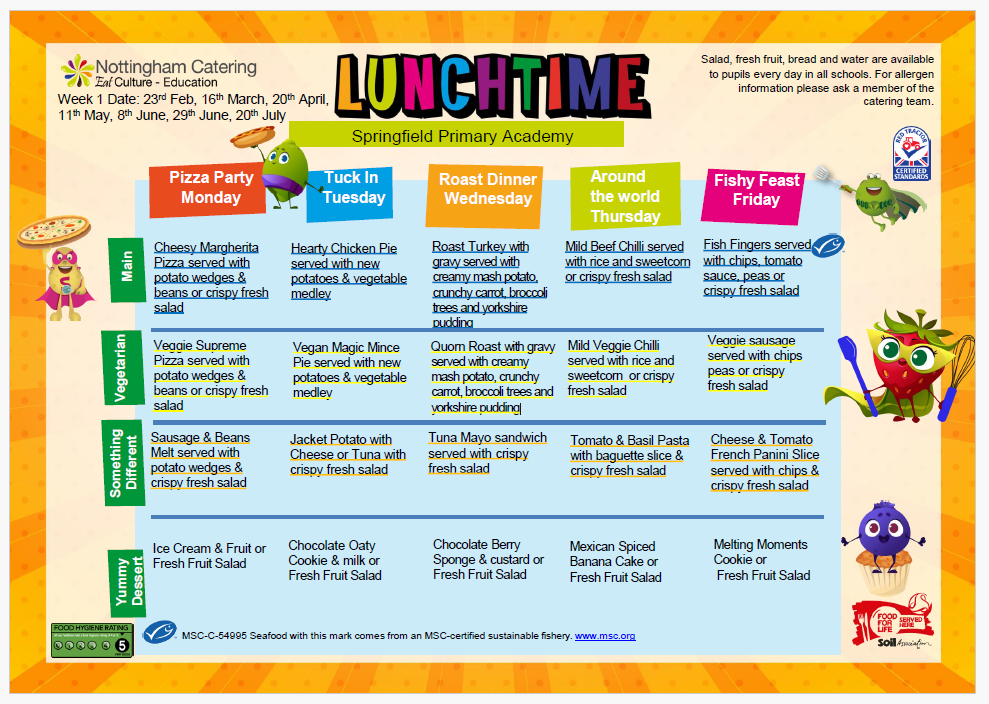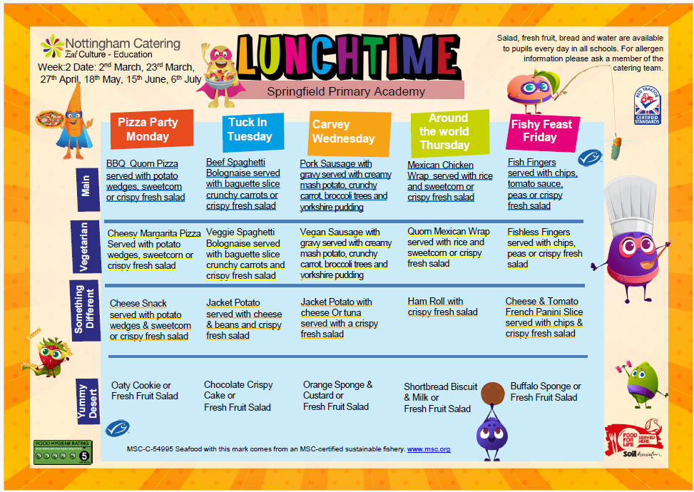 Please remember children should either have dinners or sandwiches on a whole weekly basis. There should be NO mid-week changing as this causes problems ordering food in advance and makes unnecessary waste. Dinners must be ordered/paid for on Mondays by 9am.